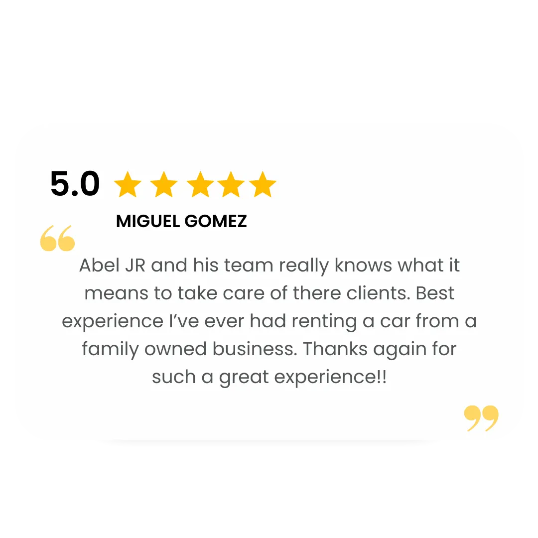 "Needed a reliable car for a week-long trip and JR delivered. Fair pricing, no hidden fees, and the vehicle was in perfect condition."